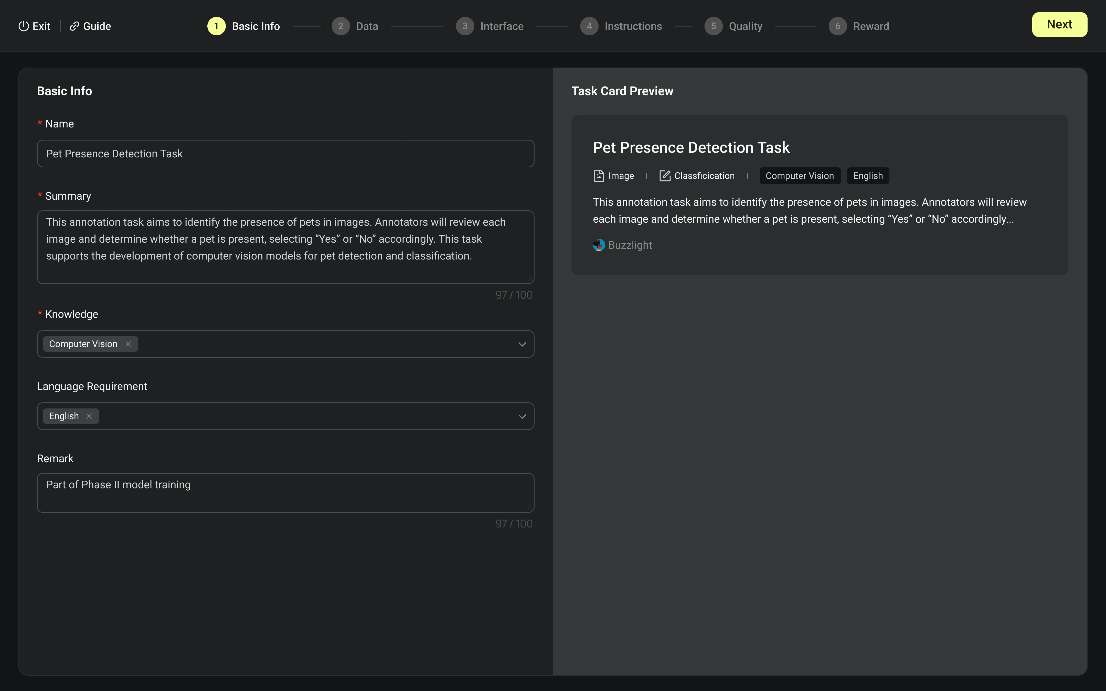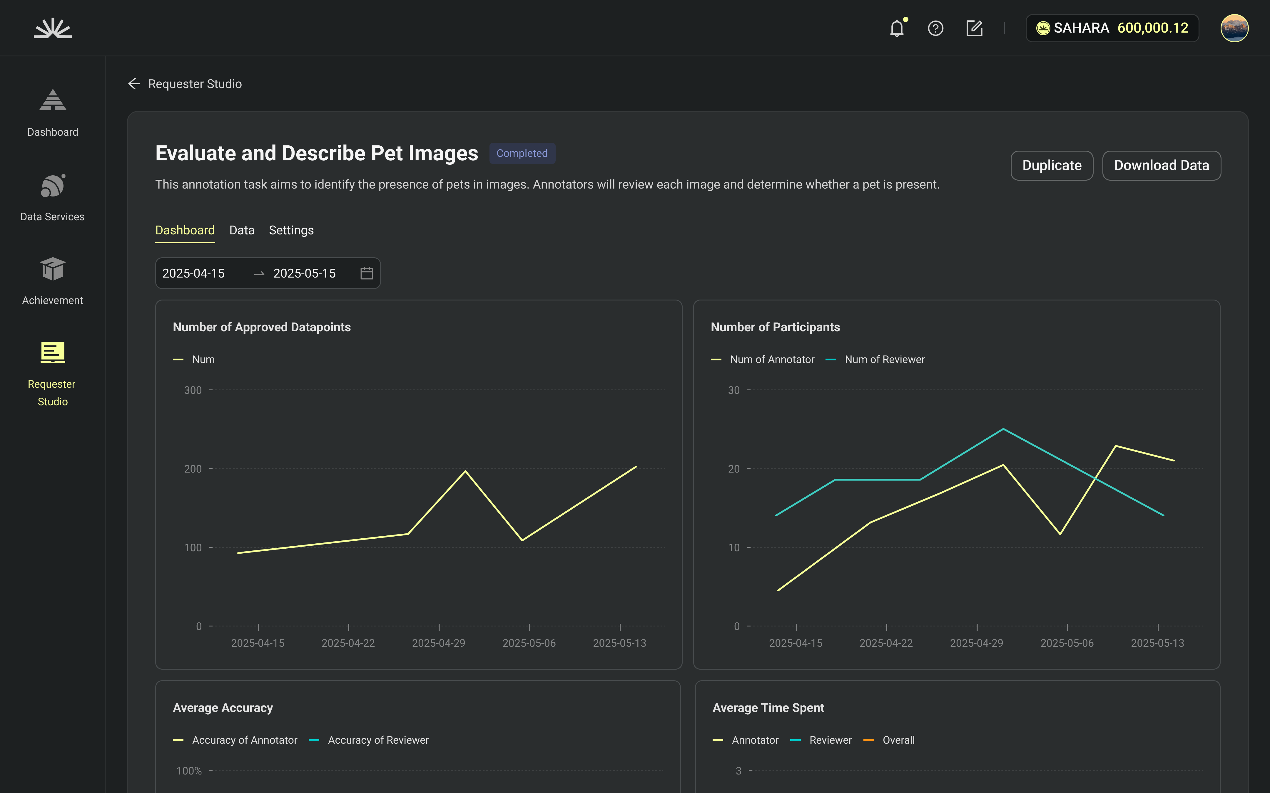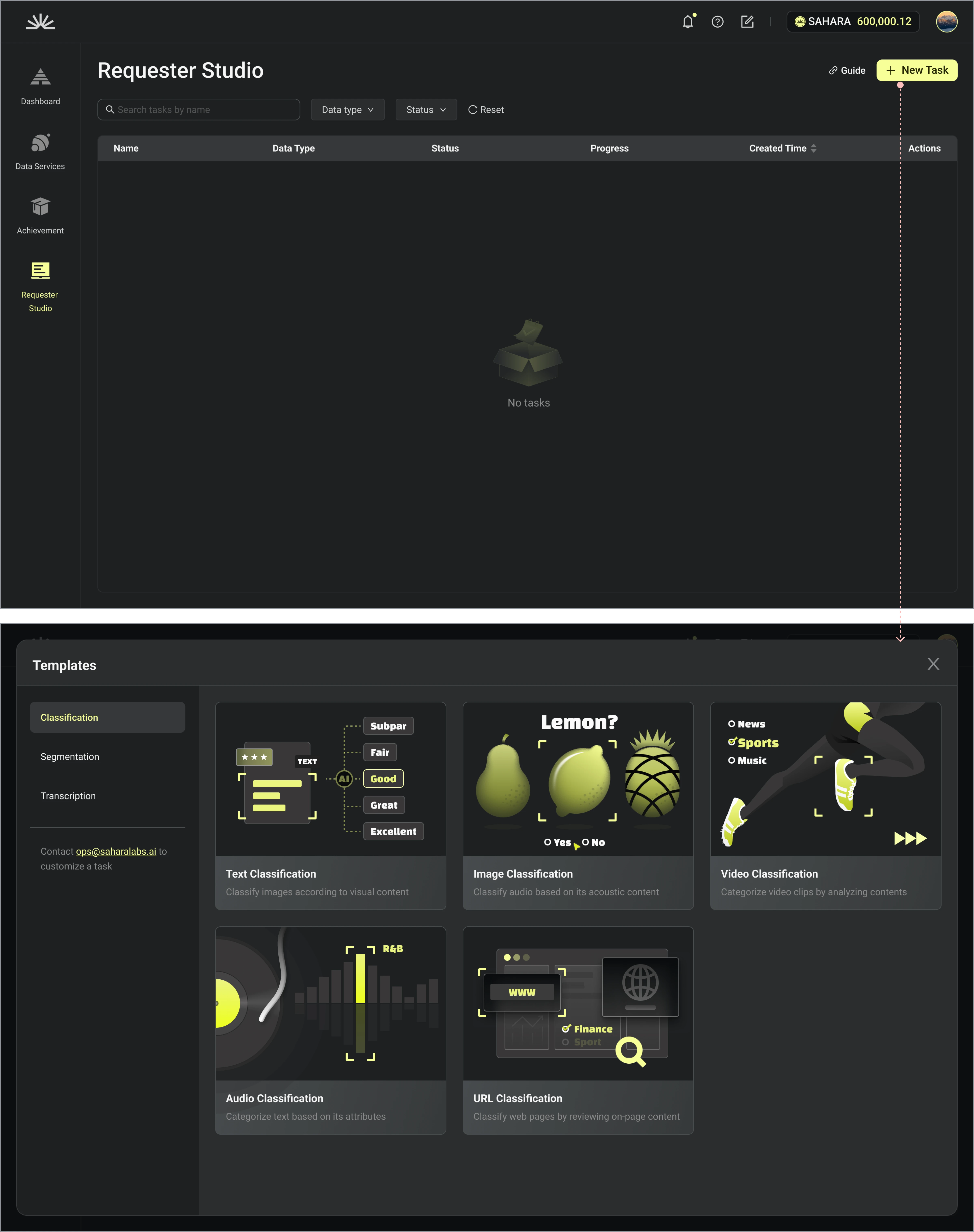 Let requester customize tasks based on their own requirements, so they can independently manage data service tasks, including uploading annotated data, setting quality requirements, defining budgets, tracking progress, and retrieving results.