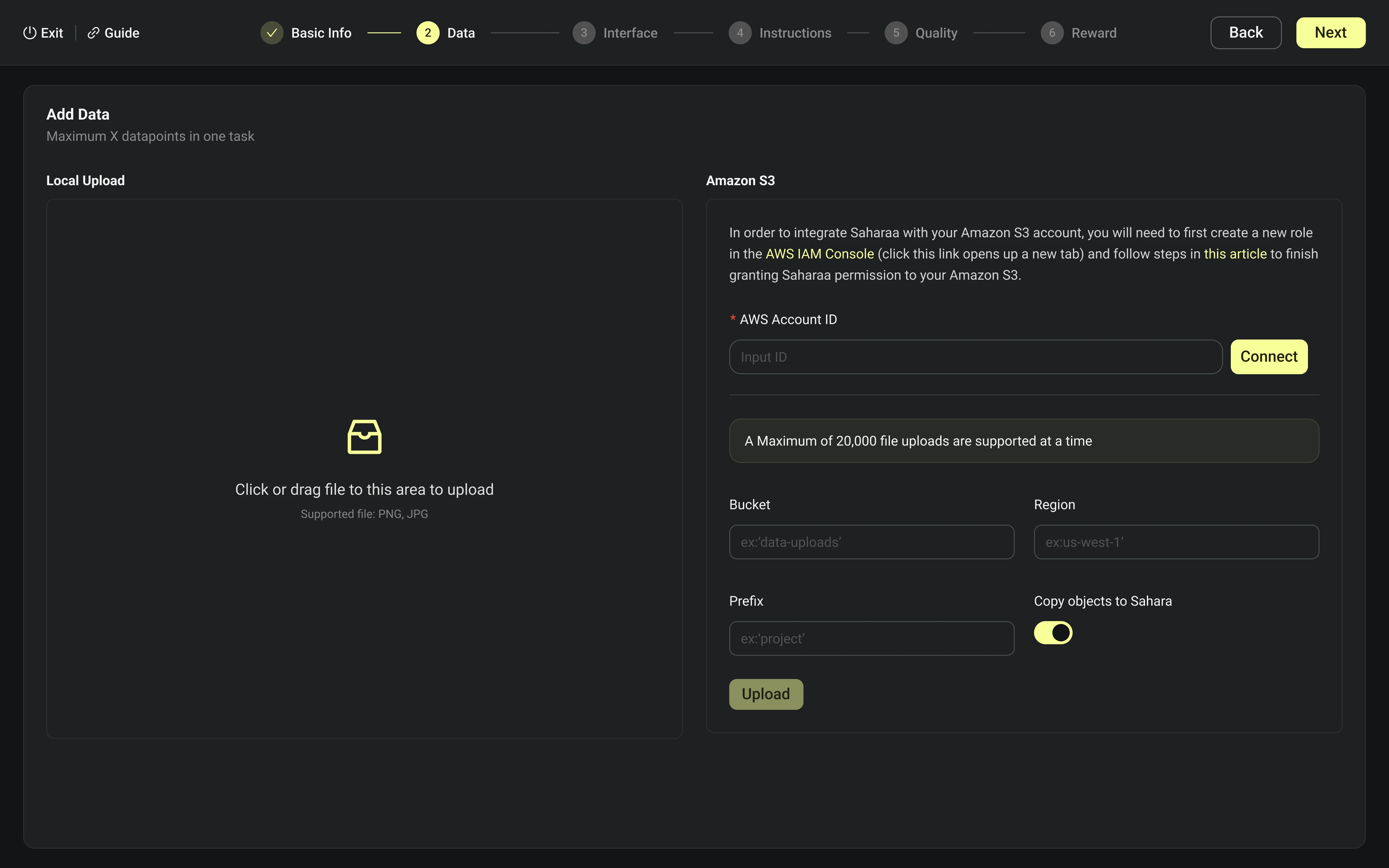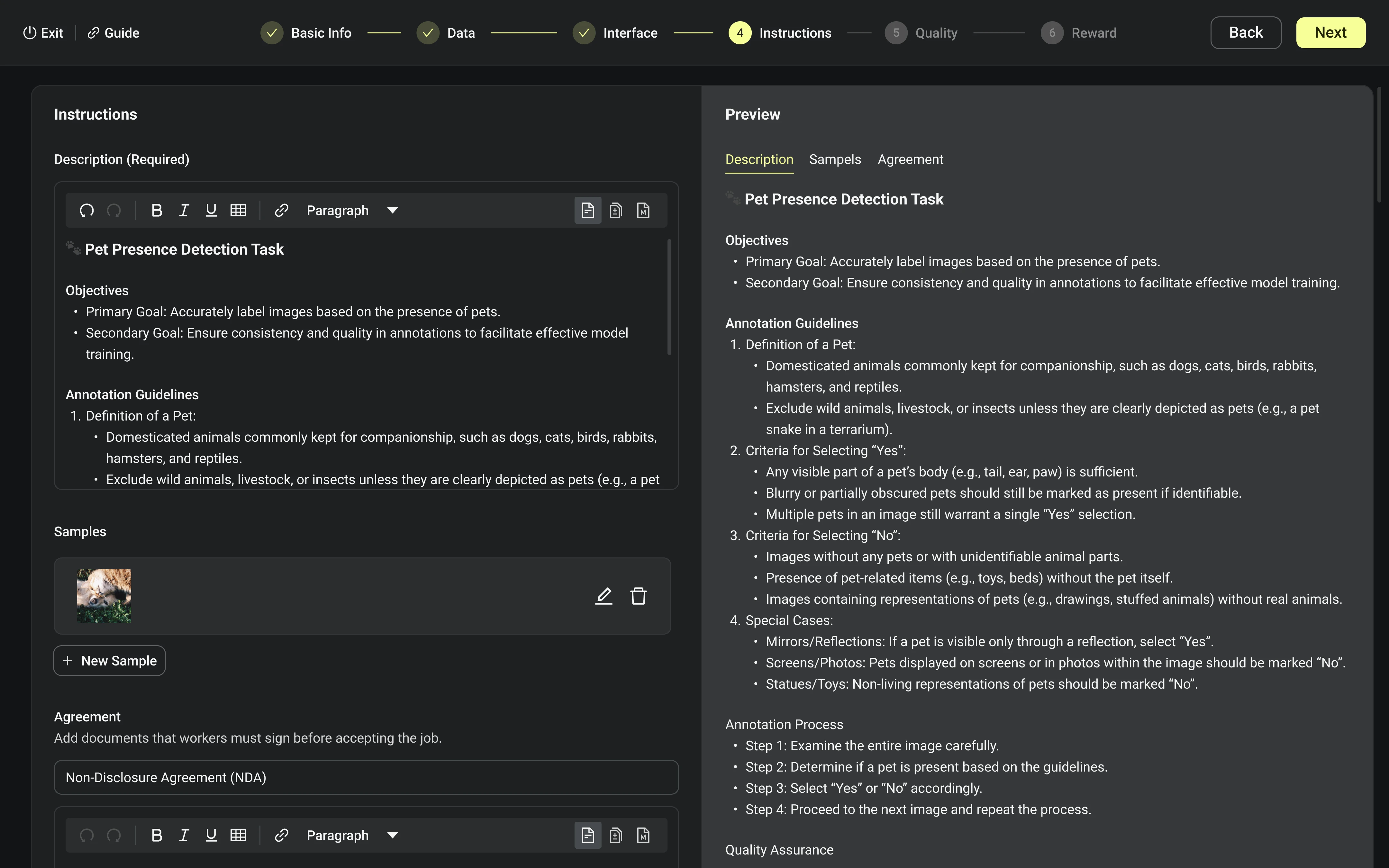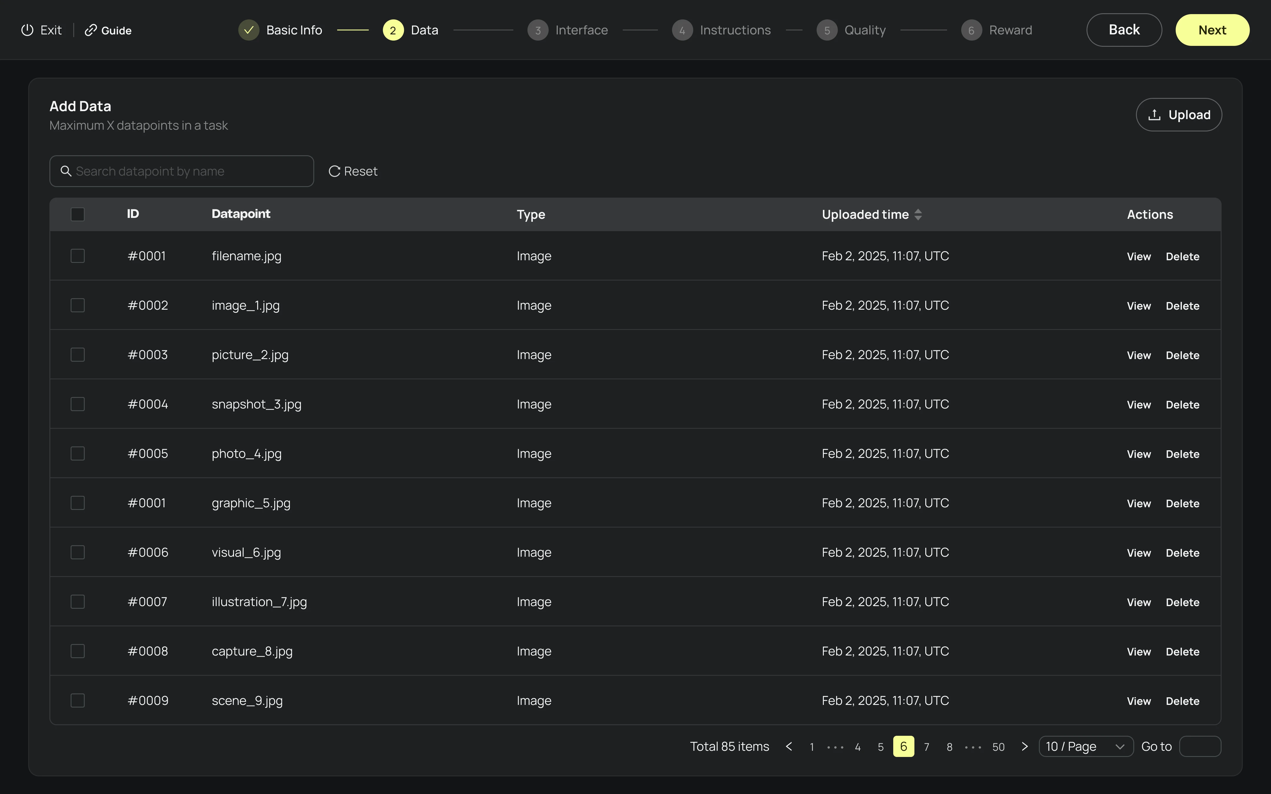 Use Case 2: As a requester, I need to finish in total 6 steps settings, they are setting basic info, uploading raw datas, designing label interface, writing instructions, set quality threshold, and adding a reward pool.
